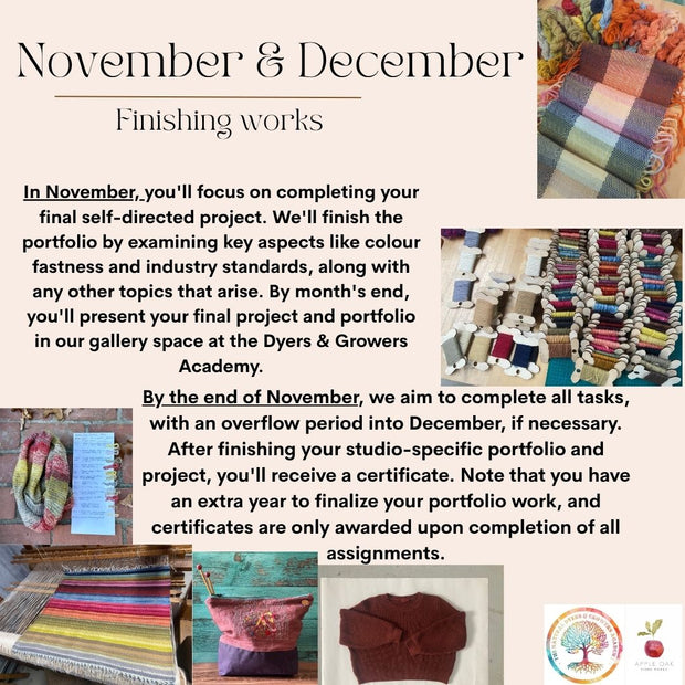 Alle Projekte werden in den letzten zwei Wochen des Kurses vorgestellt und gefeiert. Der Kurs endet in der ersten Dezemberwoche mit einer abschließenden Live-Sitzung, bei der jeder Teilnehmer sein AppleOak FibreWorks Natural Dye Academy-Zertifikat erhält.