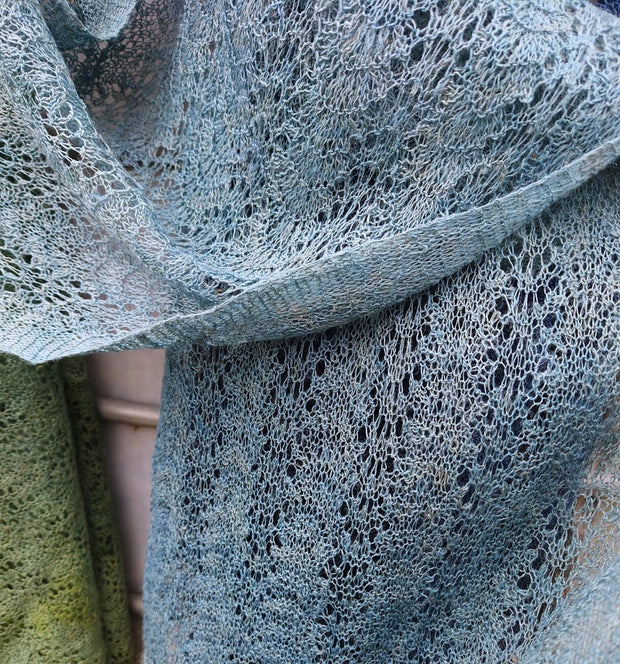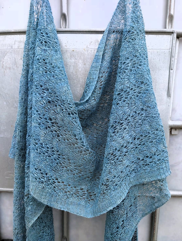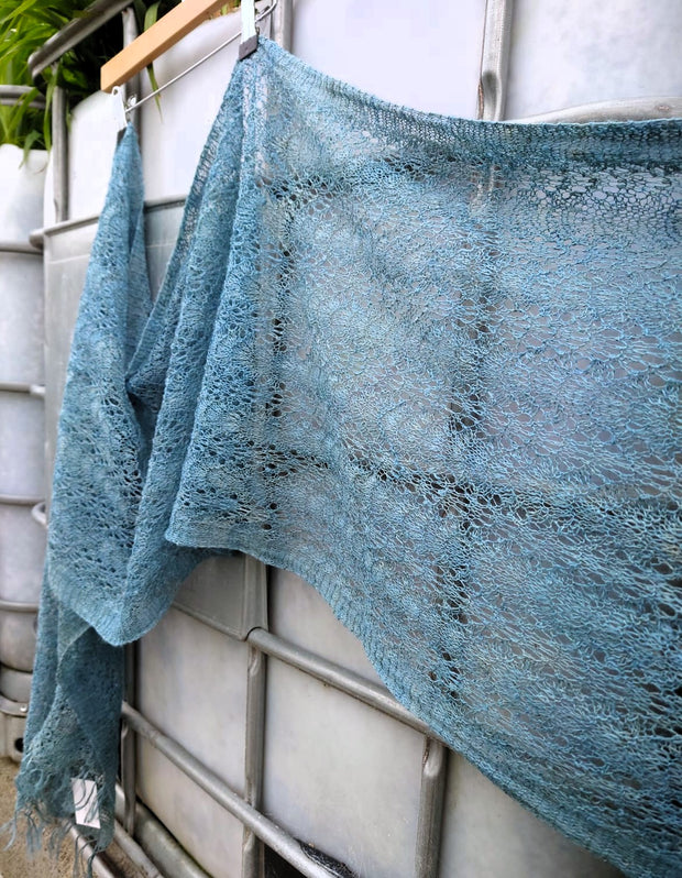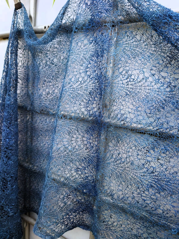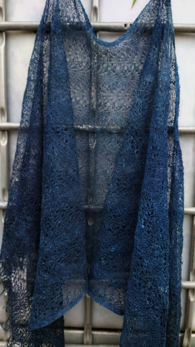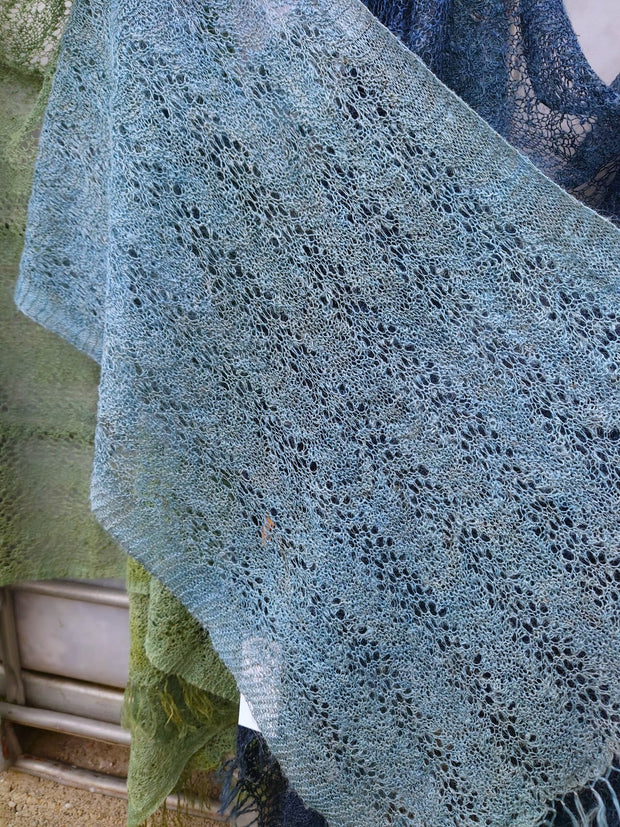 Your shawl will be a close match to the photographs, while remaining entirely unique — a light indigo blue that carries the marks of hand, plant and place.