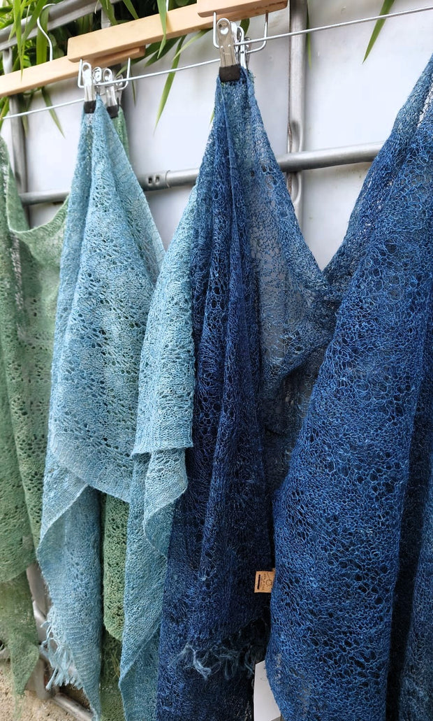 Though the same recipe and ingredients are used each time, the living nature of indigo and the natural variation in nettle fibre ensure that every shawl is unique. Your piece will be a close match to the photographs, yet unmistakably one of a kind.