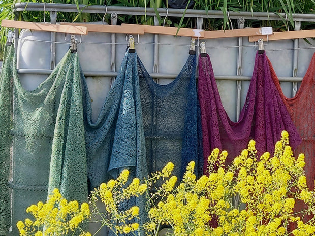 Once finished, the undyed shawls travel directly to our dye studio in County Clare, where they are carefully scoured and coloured using rain-harvested water, slow cold-mordant methods, and pure botanical dyes. The process is gentle on fibre, low-energy, and entirely free from synthetic chemicals or heavy metals.